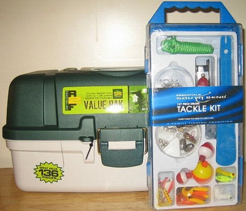 All you need plus more to start fishing right now! Tackle Box Includes (136 pc.): Three assorted floats; one 1/8 oz. jig head; one 1/4 oz. jig head; ten each size BB, 3/0 & 7 split shot; one 6' poly stringer; thirty size 2 baitholder hooks; two 6" curl tail worms; two each 3" & 4" curl tail grubs; thirty-one each size 4 & 6 baitholder hooks. Deluxe Tackle Kit Includes: South Bends 137 Piece, Deluxe Tackle Kit, Handy Plastic Kit With Carrying Handle Contains Poly Stringer, Snelled Hooks, Combination Scaler, Hook Disgorger, Ruler, Furnished Line, Marabou Jigs, Assorted Sinkers, Floats, Assorted Style Hooks, Spoon Spinner & Single Spin Lures, Ideal For The Beginner Or More Experienced Angler, Packaged In Plastic Box Designed For Peg Board Display.